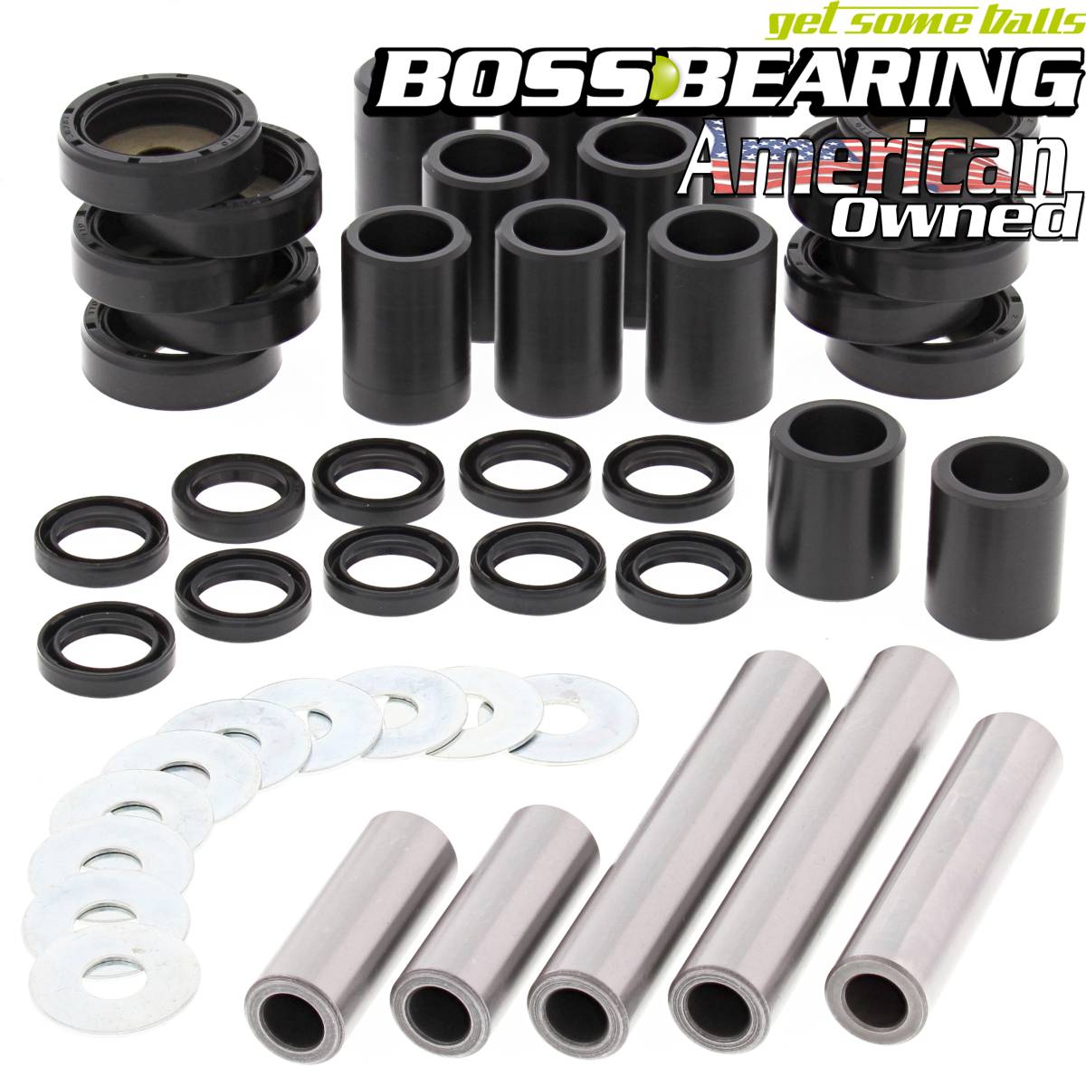 Kit Contains: 10 Delrin Bushings; 5 Needle Bearing Shafts; 10 Washers; 20 Seals Note: Please review product image for accurate representation of product contents.
