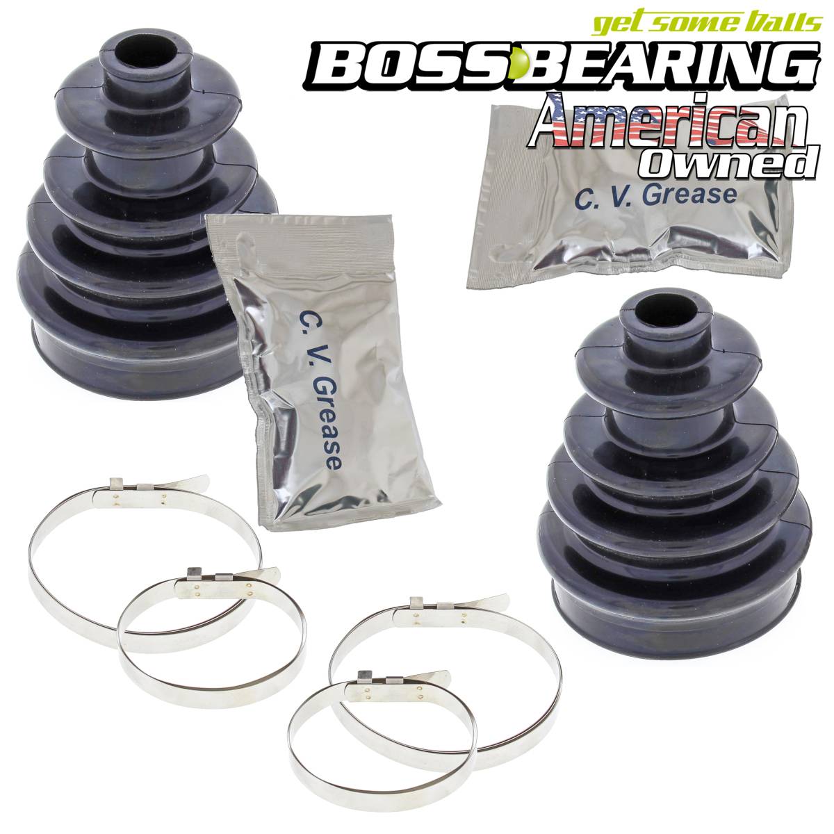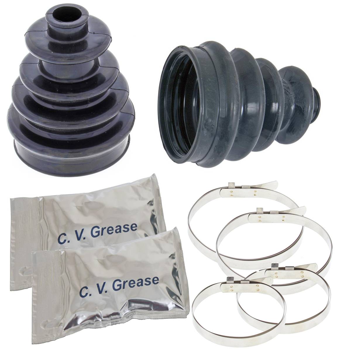 Kit Contains: 2 CV Boots made from an OEM grade DCR66 rubber, 4 Stainless Steel clamps designed to be tightened without the use of any special tools and 2 Packets of Lithium-based molybdenum grease.