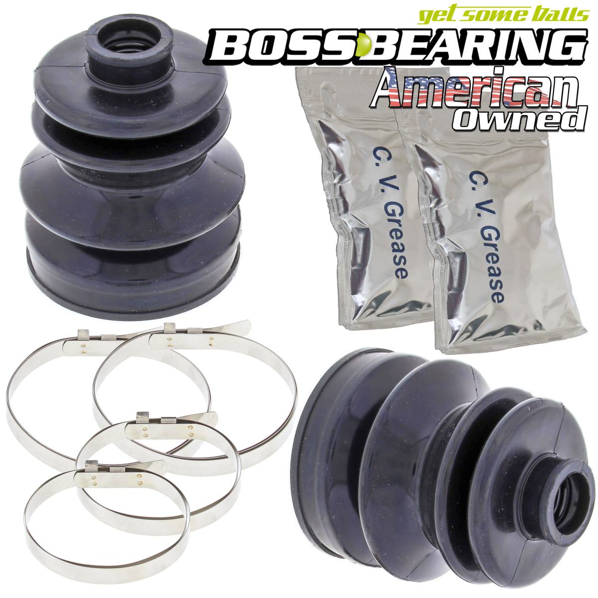 Kit Contains: 2 CV Boots made from an OEM grade DCR66 rubber, 4 Stainless Steel clamps designed to be tightened without the use of any special tools and 2 Packets of Lithium-based molybdenum grease
