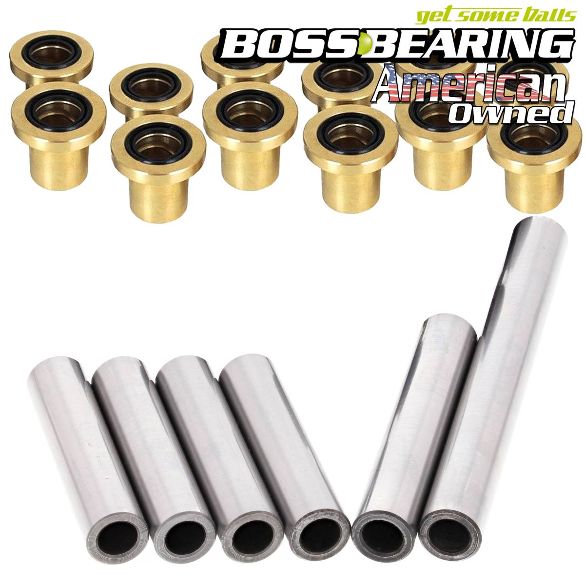 Boss Bearing 50-1135UP Bronze Upgrade! Rear Independent Suspension Bushing Kit. Reduce slop and downtime with our exclusive Boss Bearing upgrade! This upgrade boasts tensile strength of 35,000 psi, yield strength of 27,000 psi and a brinell hardness of 72! Our upgrade allows you to keep contamination out and clean grease in! Our kit features: